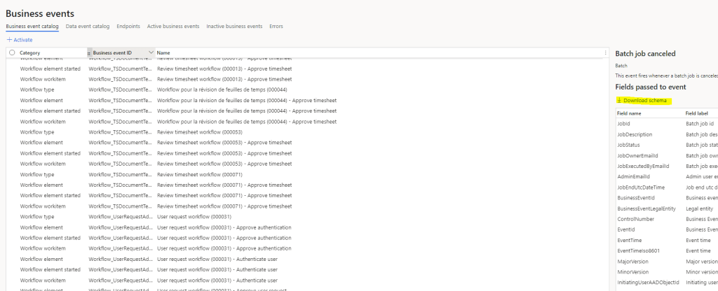 First of all, we need to identify the BE that we are going to use. For that, we have to go to System Administration > Business Events > Business events catalog. In our particular case we are going to use one for reviewing timesheets. Once we have found the correct one, we download the schema.