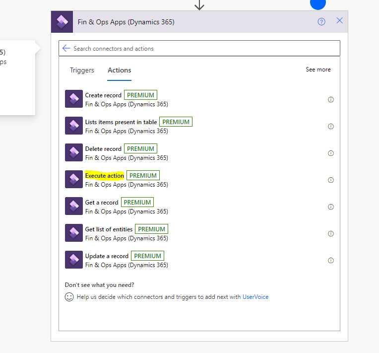 Step 2: type Execute action (Fin & Ops Apps (Dynamics 365)).