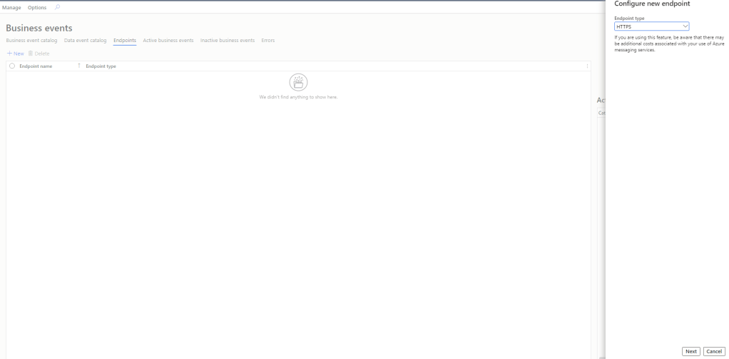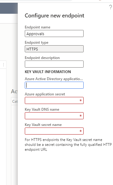 We have now all the ingredients for our recipe, let’s go back to business event catalog in F&O, navegate to the tab Endpoints and create a new one manually. (Note that usually this step is automatically done when using Business Events from Power Automate, but as we are not using the Business Event trigger directly but a Http call instead, to make it reusable, we have to create the endpoint, and also we had to create the Key Vault).