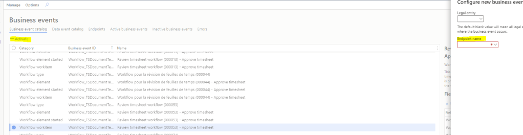 If we didn’t do any mistake, we will be able to accept without errors. Once we have our new endpoint, let’s go to the business event we want to activate, click on activate and select the new endpoint we have just created.